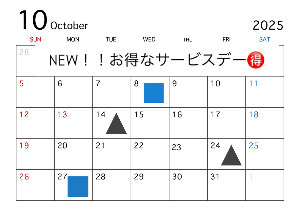 11月のスケジュールをアップしました! 今月もお得なサービスデーを作成中です。(^^♪ ポイントカードやお友達ご紹介カードなどもお得にご活用ください。